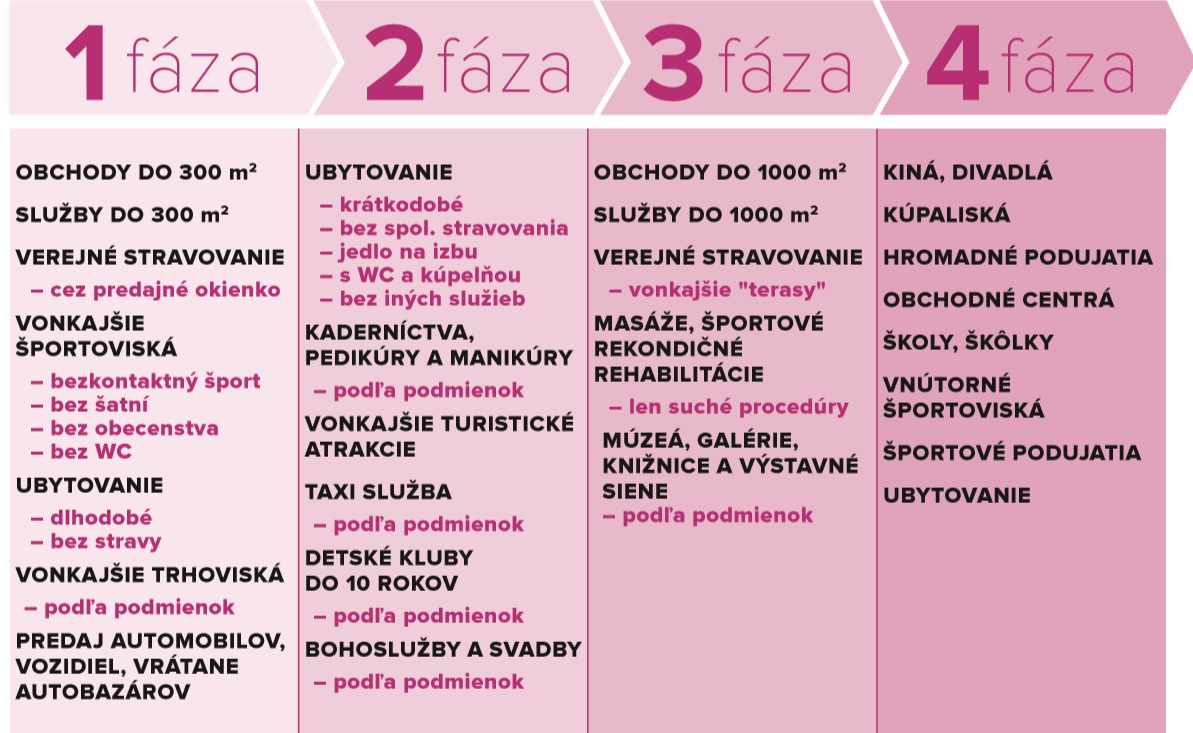 Ak bude priemerný prírastok infikovaných pod sto, bude sa pokračovať v otváraní podľa harmonogramu. Ak to bude od sto do 150, neprejde sa k ďalšej fáze, ale zachovajú sa otvorené tie prevádzky a obchody, ktoré už sú otvorené. Ak bude nárast viac ako 150, tak sa zatvoria prevádzky otvorené v predchádzajúcej fáze.